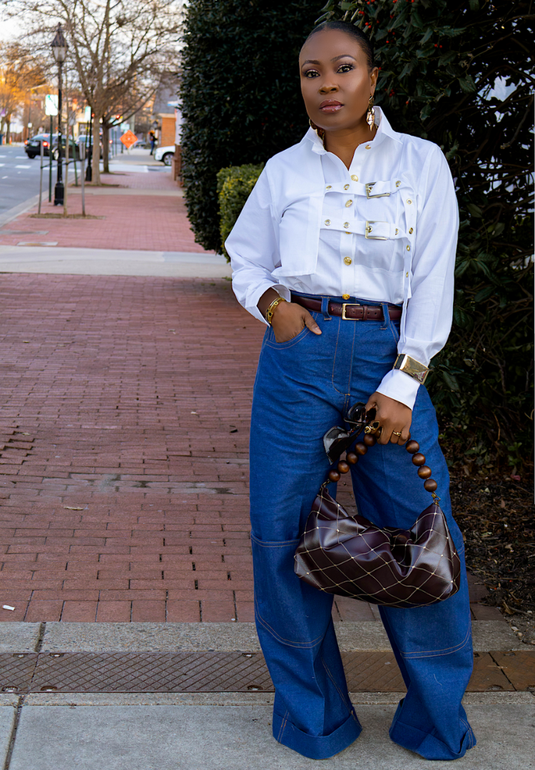 - Luxurious Gold Buckle Detailing – Adds a touch of opulence and elegance to a classic white shirt.
