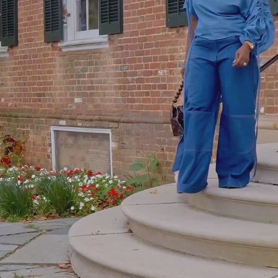 This chic asymmetrical top is crafted from 4 oz lightweight light blue denim, offering a soft, breathable feel with modern flair.